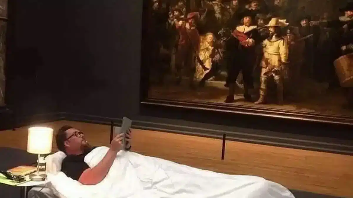 El Rijksmuseum de Ámsterdam permitió por primera vez que un visitante pasara la noche en una de sus salas y el afortunado fue Stefan Kasper, profesor de arte quien tuvo la oportunidad de dormir junto al cuadro La ronda de noche de Rembrandt, tras convertirse en el visitante número 10 millones desde la reapertura del museo en 2013.